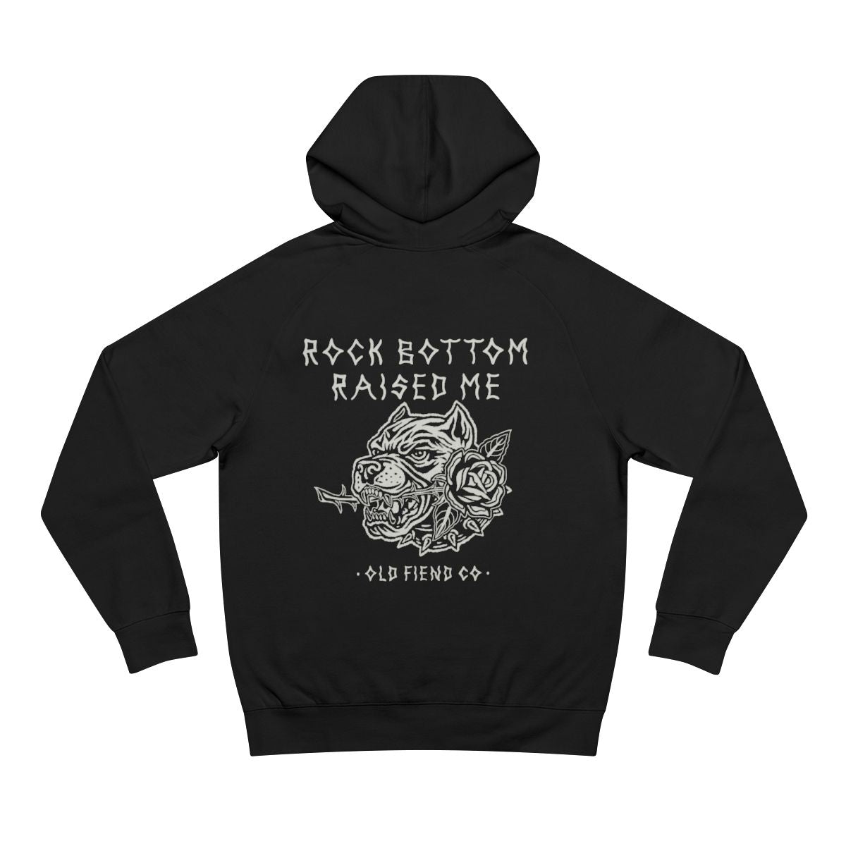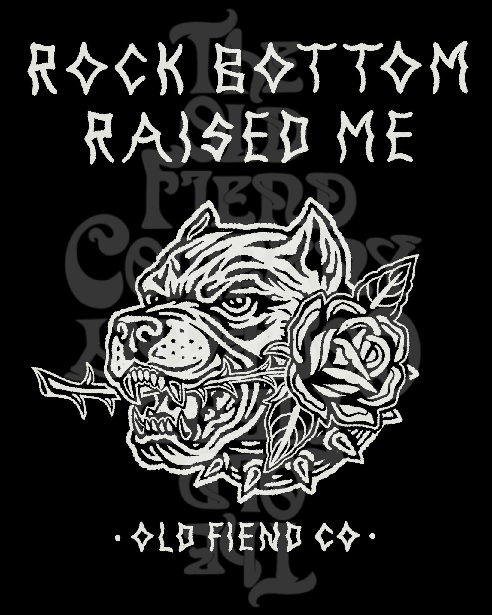 Hand-drawn in The Old Fiend Co. style — gritty tattoo-inspired lines, bold shapes, and that classic pitbull and rose combo. Heavy traditional tattoo energy with streetwear grit.